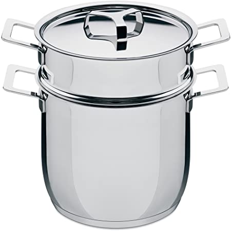 Il pasta-set è lo strumento indispensabile per gli estimatori della pasta, permettendo di cuocerla e scolarla usando un unico strumento. Realizzato in acciaio inossidabile, il pasta-set della serie Pots&Pans è robusto, e al tempo stesso pratico e maneggevole. Un oggetto dal design minimale, accuratamente studiato in tutti i dettagli funzionali.