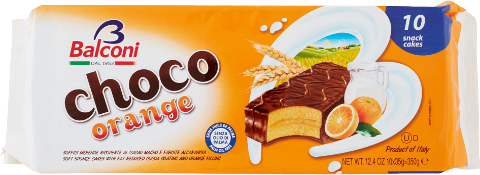 Sciroppo di glucosio-fruttosio, Aromi, Emulsionanti: mono- e digliceridi degli acidi grassi, lecitina di soia, Cacao magro in polvere (4%), Farina di frumento (11.3%), Agenti lievitanti: carbonato di ammonio, carbonati di sodio, difosfati, Burro di cacao, Latte scremato in polvere, Latte scremato (7%), Oli vegetali (cocco, girasole, olio di oliva in proporzione variabile), Succo d’arancia (2%), Lattosio, Zucchero, Scorze di arancia candite (2.7%) (scorze di arancia 53%, sciroppo di glucosio-fruttosio, zucchero, correttore di acidità: acido citrico), Uova fresche, Proteine del latte, Sale.