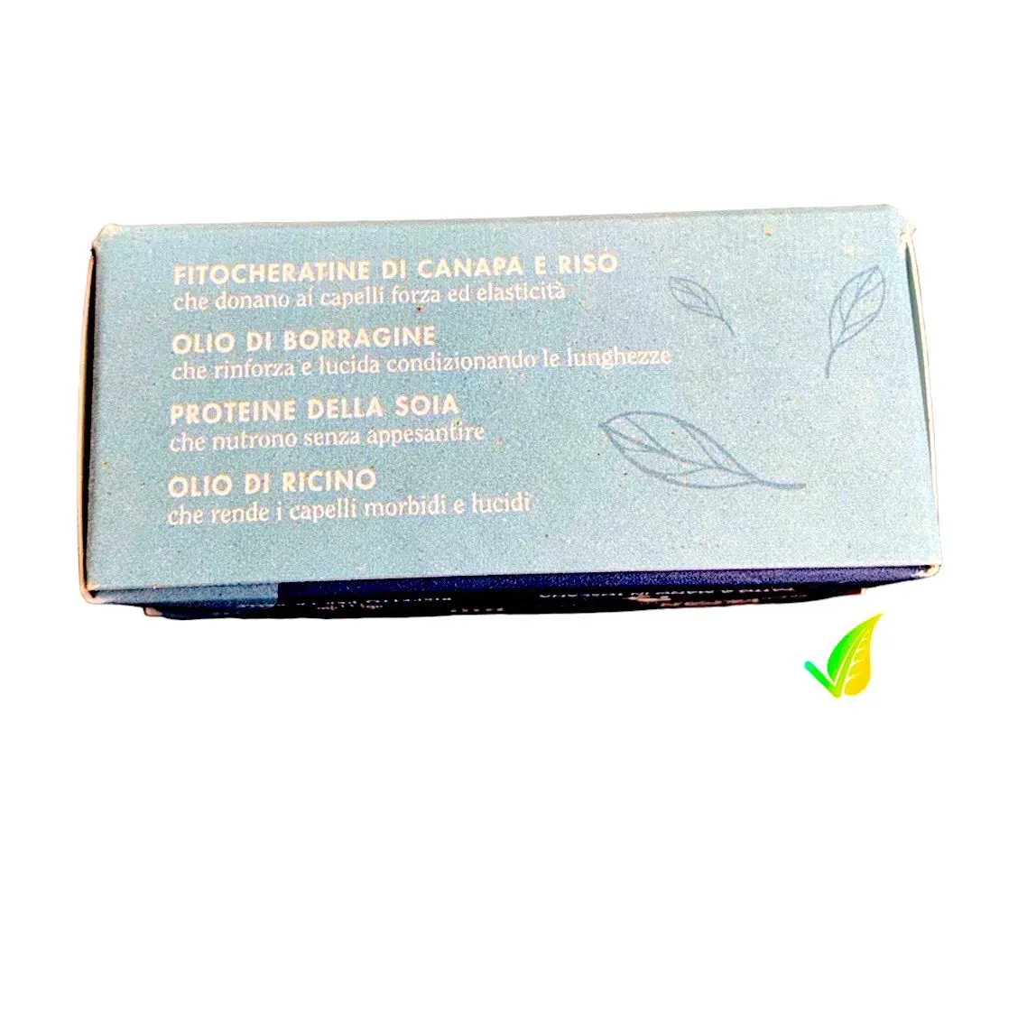 Contiene fitocheratine di Canapa e riso che ristrutturano i capelli donando forza e vitalità e l’olio di Borragine che lucida, condiziona le lunghezze e previene la caduta dei capelli.
