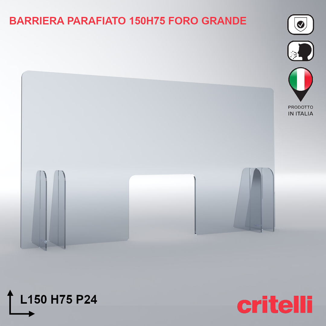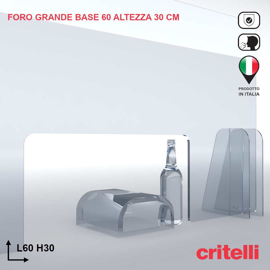 Lo schermo protettivo con grande foro è utile per attività che richiedono una maggiore area aperta di utilizzo, tipo: attività commerciali, ristoranti, pizzerie, attività di ristorazione, take away, alimentari, pasticcerie, panetterie, bar, estetiste, manicure, nails e in generale per chi ha bisogno di un foro di passaggio agevole alla propria attività.