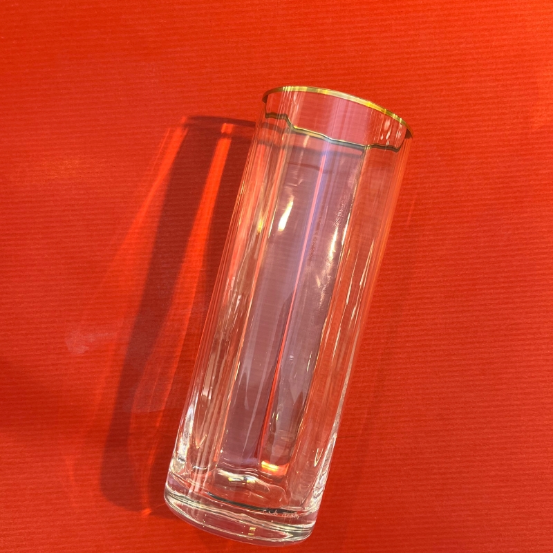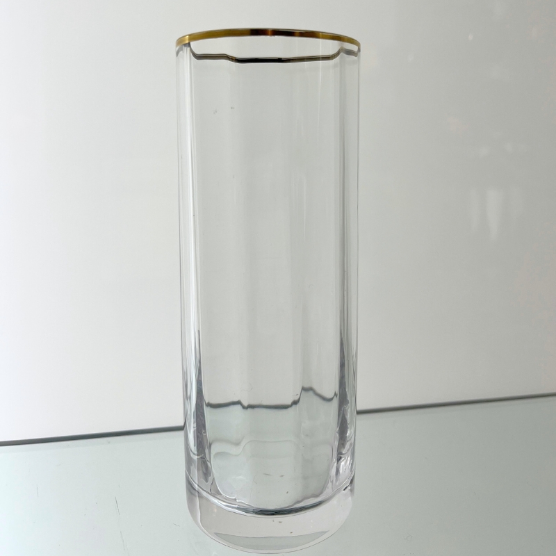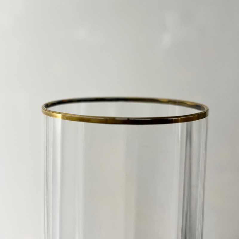 Bicchiere da Champagne o long drink alto e stretto in vetro soffiato di Murano, leggermente dodecagonale con bordo dorato.