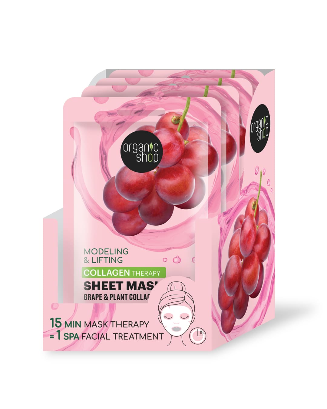 Ritrova tonicità e compattezza con la Collagen Therapy Sheet Mask di Organic Shop, una maschera viso in tessuto ad azione elasticizzante e modellante, formulata con collagene vegetale e uva biologica.