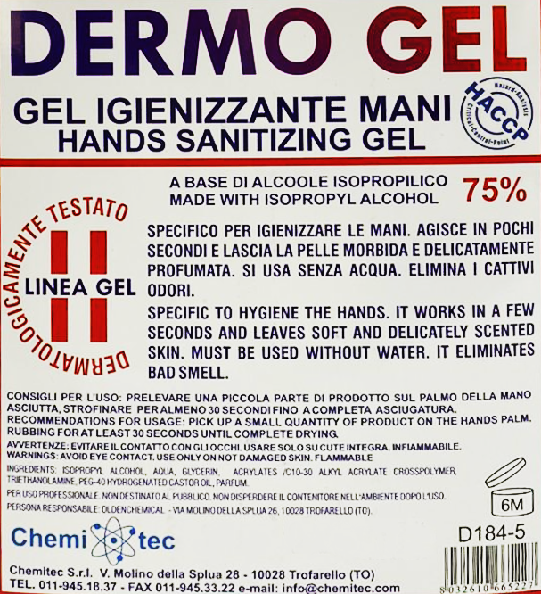 Il prodotto è conforme alle direttive dell’OMS riguardo ai Dermo Gel