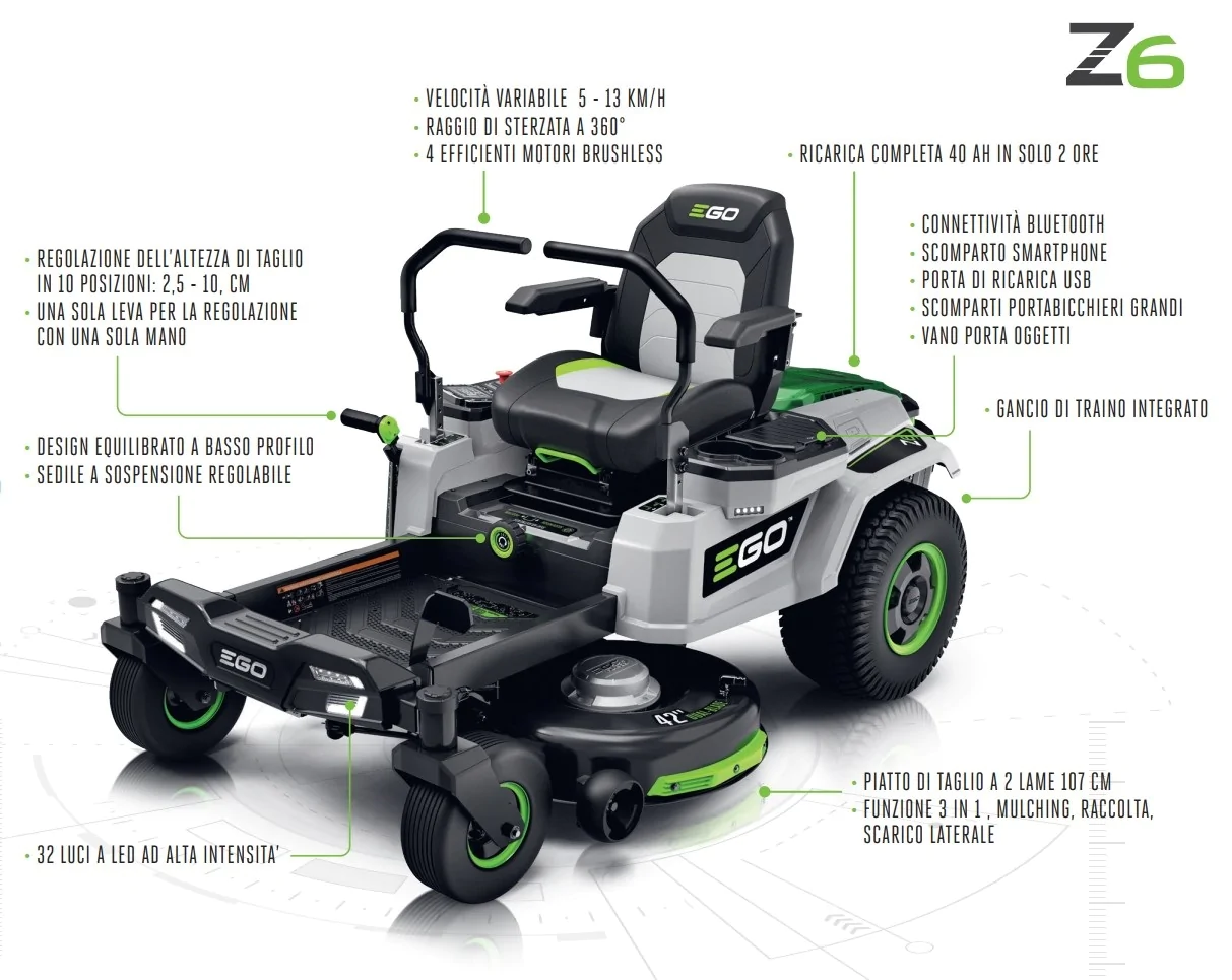 Fornendo la potenza equivalente ad un motore a benzina da 22 cavalli, senza alcuna emissione, lo Z6 copre fino a 10.000 m2 con una singola carica con sei batterie da 12 Ah. Puoi adattare la combinazione di batterie esattamente in base alle dimensioni del tuo prato e al modo in cui preferisci tagliare l’erba, a differenza di qualsiasi altro ZTR a batteria sul mercato.