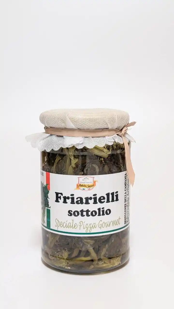 I Friarielli napoletani sott’olio vengono ottenuti dalla macerazione in aceto di vino di una tipica verdura napoletana i cosi detti “friarielli”. Essi vengono poi conditi con aglio, olio, peperoncino, invasettati e pastorizzati con tecnologie moderne. E’ particolarmente l’ideale per la preparazione di bruschette, panini e come contorno di antipasti e secondi piatti a base di carne, cacciagione e selvaggina