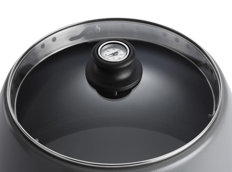 Cappa per LotusGrill in acciaio inox con una parte di superficie in vetro temprato trasparente.