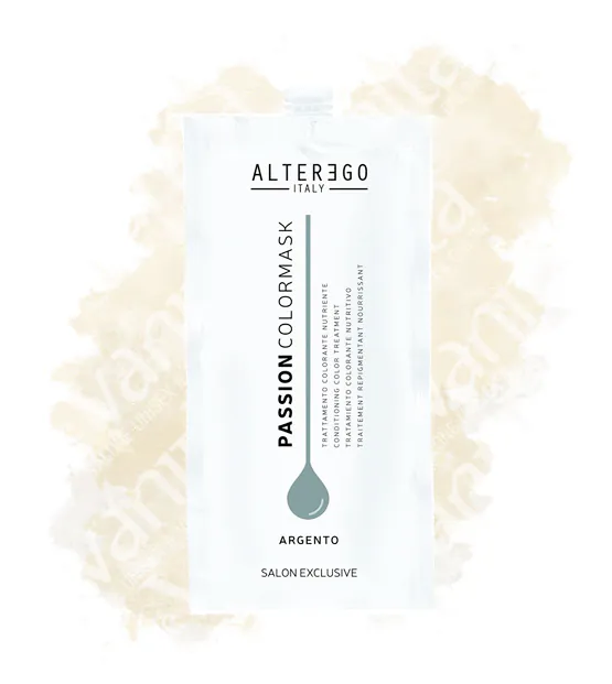 PASSION COLOR MASK ARGENTO Alterego è una Maschera colorata ravvivante color Argento. Una Crema colorata per un trattamento colorante senza ammoniaca che intensifica e tonalizza i capelli naturali, colorati o con méches. Dona brillantezza straordinaria ai capelli opachi e spenti, ravvivando ed esaltando il colore cosmetico. Doppio effetto che nutriente e idratante.Non copre la ricrescita ne i capelli bianchi.