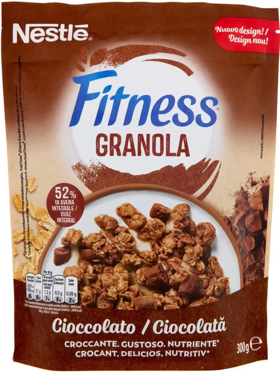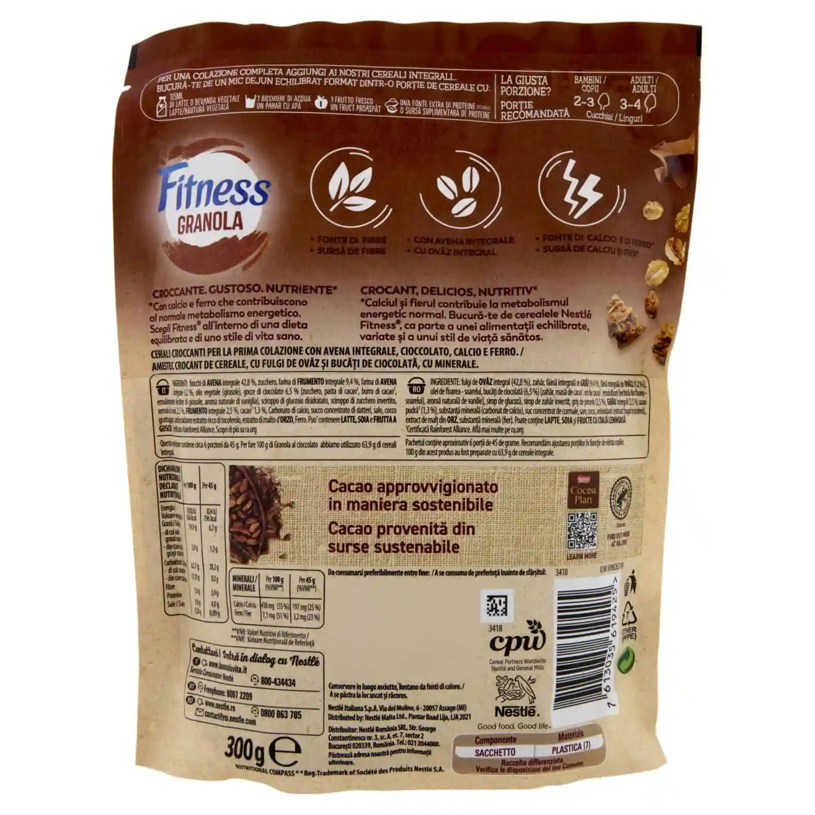 Fiocchi di avena integrale 42,8 %, Zucchero, Farina di frumento integrale 9,4 %, Farina di avena integrale 9,2 %, Olio vegetale (girasole), Gocce di cioccolato 6,5 % (zucchero, pasta di cacao¹, burro di cacao¹, emulsionante lecitine di girasole, aroma naturale di vaniglia), Sciroppo di glucosio disidratato, Sciroppo di zucchero invertito, Semola di mais 2,5 %, Frumento integrale 2,5 %, Cacao¹ 1,3%, Carbonato di calcio, Succo concentrato di datteri, Sale, Cocco grattugiato, Antiossidante estratto ricco di tocoferolo, Estratto di malto d’orzo, Ferro. Può contenere latte, soia e frutta a guscio.