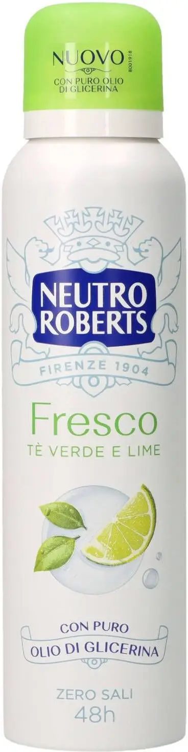 Neutro Roberts Deodorante Spray Sensibile thè verde e lime. Efficacia e protezione fino a 48 ore, formulato con puro olio di glicerina garantisce una maggiore protezione della pelle. Non lascia macchie e aloni, senza sali d’alluminio, ideale per pelli sensibili