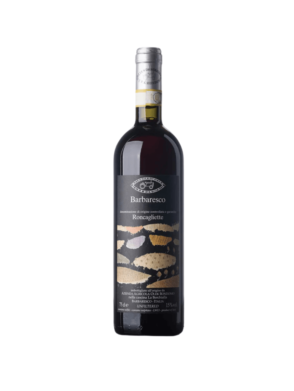 Barbaresco Roncagliette di Olek Bondonio, un Nebbiolo autentico ed elegante, ottenuto dalle pregiate sottovarietà Michet e Lampia. Le uve, raccolte da viti di oltre 35 anni nel rinomato cru Roncagliette, a 280 metri di altitudine nel cuore di Barbaresco, raccontano una storia di tradizione e territorio.