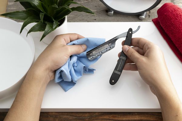 La maggior parte dei rasoi a mano libera sono realizzati in acciaio al carbonio, un acciaio molto tagliente ma vulnerabile all’ossidazione. Per evitare macchie sulla lama, sciacquare il rasoio con acqua tiepida dopo la rasatura. In seguito, asciugarlo tamponandolo con un panno senza toccare il bordo tagliente. Conservarlo aperto, in un luogo asciutto. Dovrebbero passare almeno 48 ore tra due applicazioni in modo che la bava da taglio sollecitata possa raddrizzarsi di nuovo. Se non usi il coltello per molto tempo, ricoprilo con un olio per la cura privo di acidi.