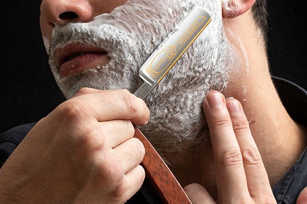 La tua rasatura inizia con l’affilatura del coltello su una coramella. Dopo aver spalmato generosamente il viso con crema da barba o olio da barba, impugna il coltello con il manico aperto rivolto lontano da te. Con la mano libera, allunga la pelle del viso per formare un’area il più diritta possibile. Posizionare il coltello con un angolo di circa 30° e raschiarlo delicatamente sulla barba. Prima con la linea, poi attraverso e infine contro la direzione della crescita.