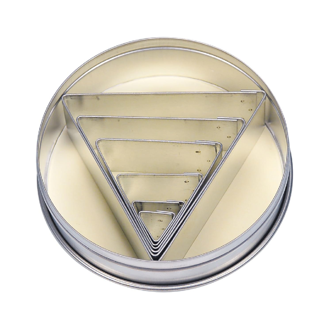 Scatola di latta contenente set di tagliapasta a forma di triangolo da cm 1,2 a cm 8,4 (totale 6 pezzi)