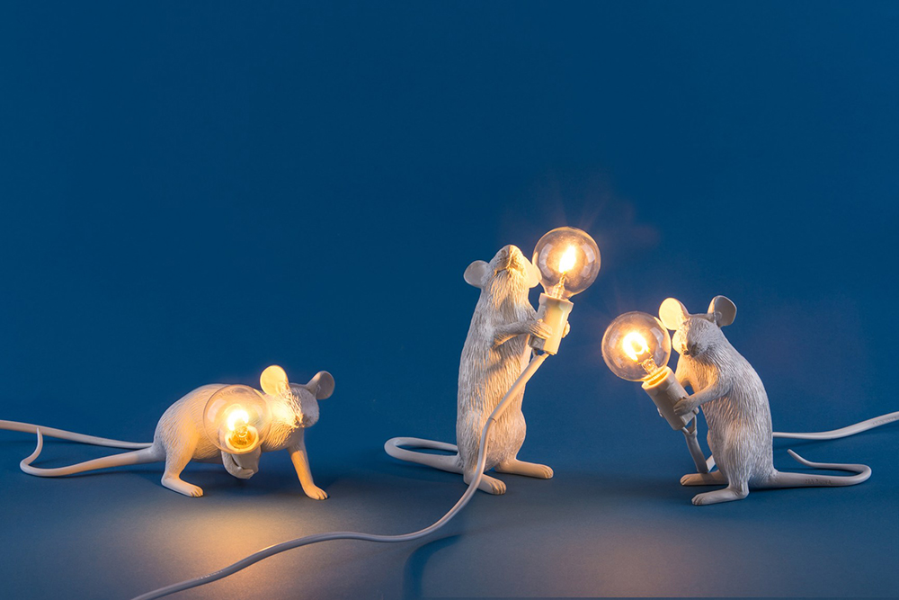 Tre topolini bianchi con una finitura molto realistica. Sono Step, Lop e Mac e corrono per casa alla ricerca di oggetti bizzarri. Di notte si illuminano con le loro piccole lampadine. Scultura stravagante che non passerà inosservata.