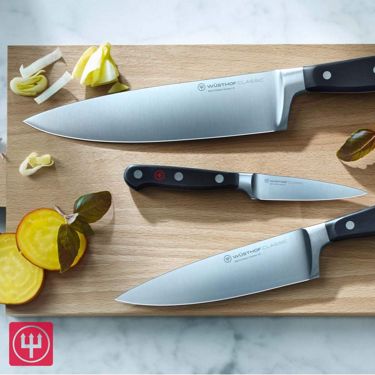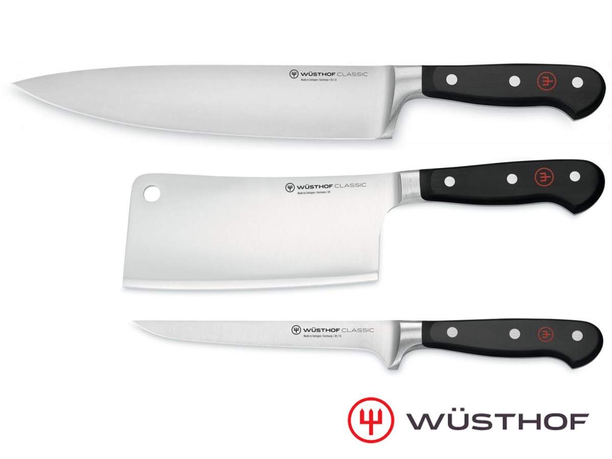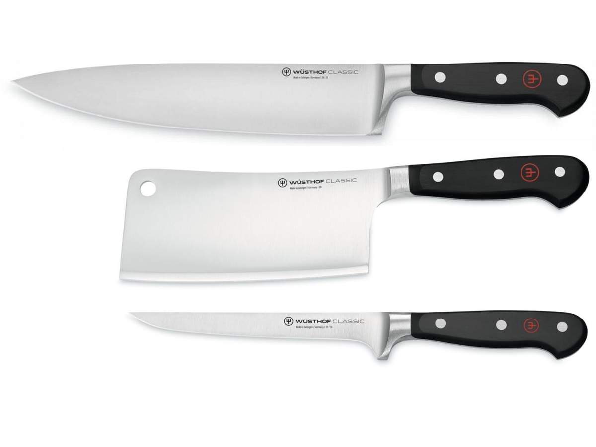 Un set di coltelli perfetto per lavorare la carne composto da un coltello da disosso adatto a rimuovere la carne da ossa e cartilagine, una robusta mannaia per tagliare e sezionare in modo netto pezzi di carne (o anche di vegetali dalla scorza particolarmente dura), e un coltello da chef che può comunque essere usato su tutti gli alimenti.