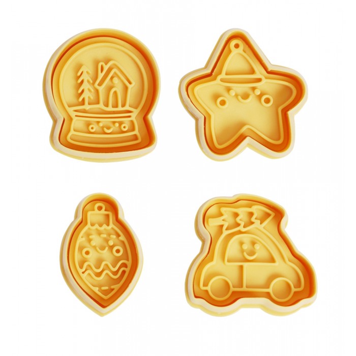 Set 4 Stampini ad Espulsione per Biscotti di Natale: Stella, Palla di Neve, Macchina di Natale, Palla a Goccia