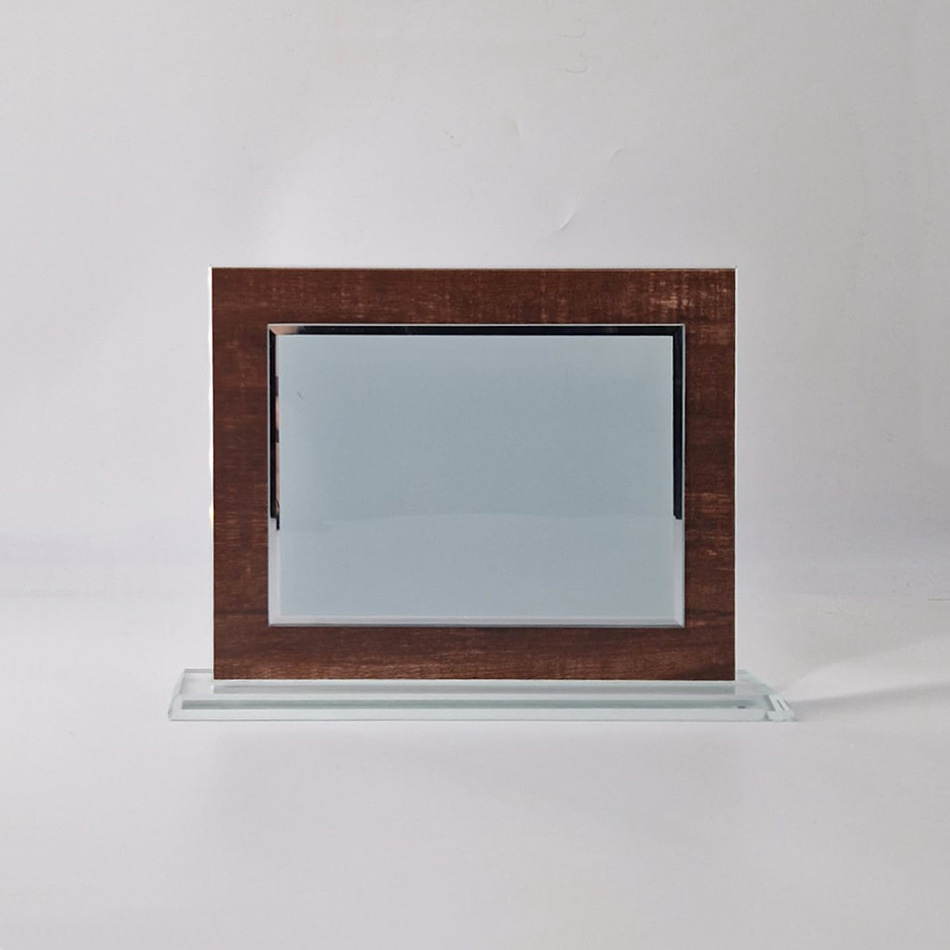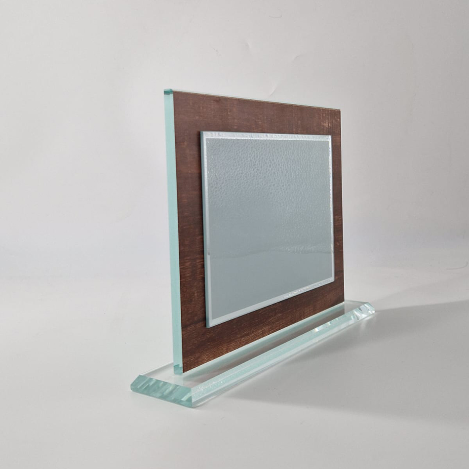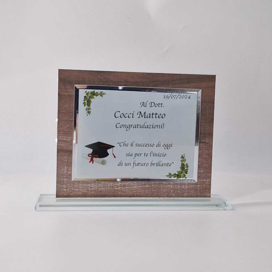Targa in Vetro/Cristallo legno Finto con targhetta 10×15 cm, completa di incisione.