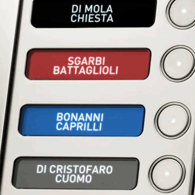 Targhetta per citofono in materiale Plexiglass, colore della finitura a scelta e personalizzata mediante incisione con testo di colore a scelta.