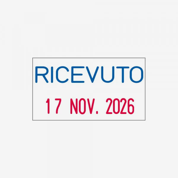 Timbro autoinchiostrante tascabile a riga singola con impronta rettangolare di 25 x 5 mm ed altezza della data 3,8 mm. E’ inclusa una riga di testo commerciale personalizzato “RICEVUTO”.La banda con datario include: data, mese e 12 anni consecutivi.