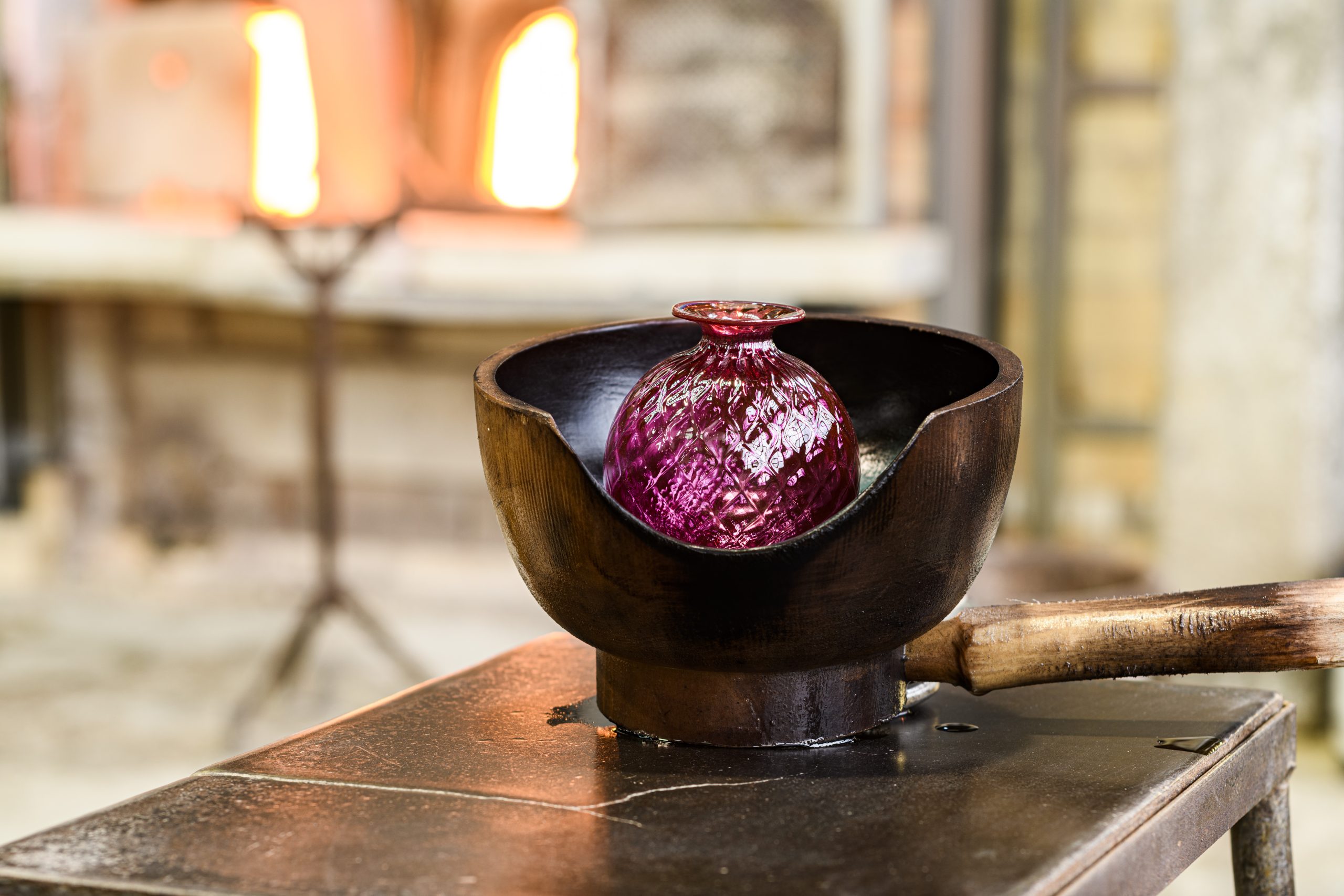 Per la tecnica del balloton il maestro si affida all’uso di uno stampo in metallo, con punte a piccola piramide dalla base quadrata lungo tutta la superficie interna della sua circonferenza. Nella soffiatura, il vetro ne riempie completamente il vuoto e restituisce un particolare effetto ottico di rilievo incrociato.