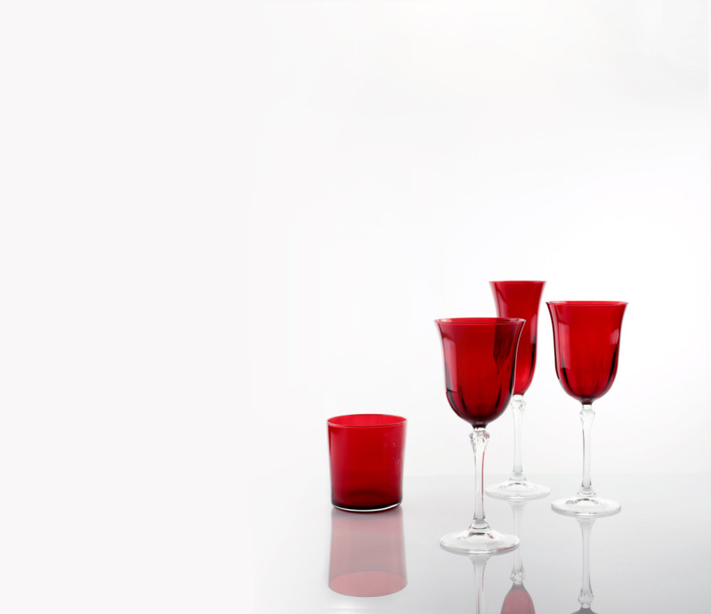 Elegante calice da vino in vetro rubino con stelo trasparente.