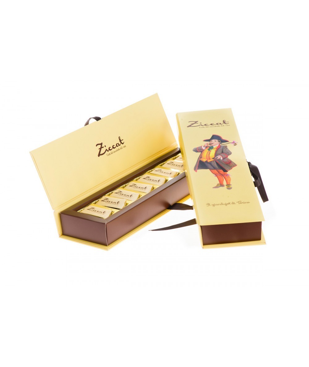 I Ziccat Gianduiotti in Scatola Libro rappresentano l’eccellenza della tradizione dolciaria piemontese, con il gianduiotto come protagonista indiscusso. Il sapore inconfondibile della gianduia si unisce a un tocco artistico che crea un connubio perfetto con il cioccolato, regalando un’esperienza gustativa unica. La confezione a forma di libro, dallo stile vintage, richiama l’eleganza di altri tempi, rendendola perfetta per chi cerca un regalo raffinato o per coloro che desiderano assaporare un classico della tradizione torinese.